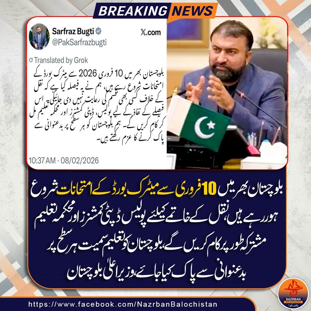 Quetta: Chief Minister Balochistan, Mir Sarfraz Bugti, has announced that the annual Matric Board examinations across the province will formally commence on February 10, 2026. He stated that the government…